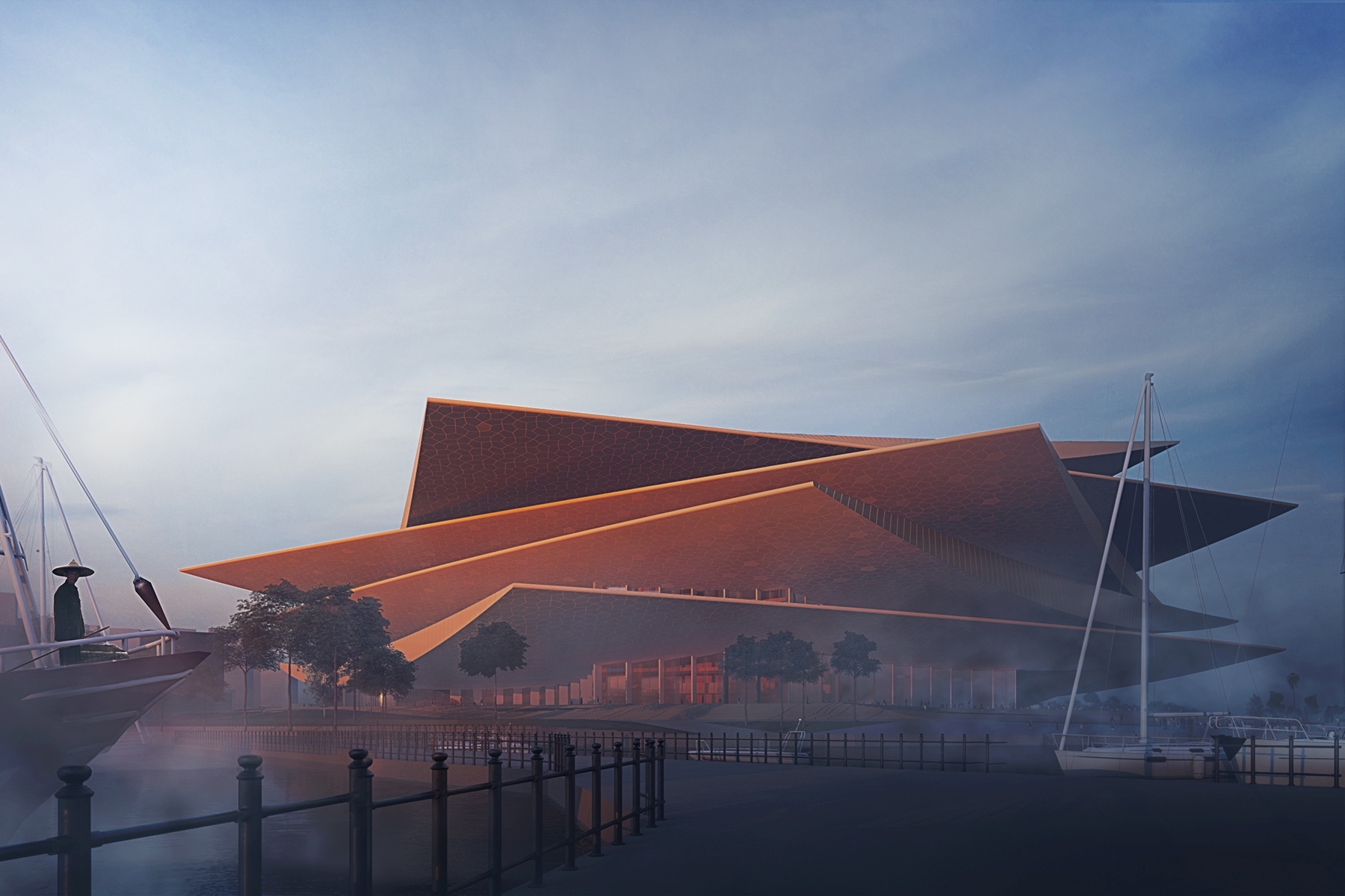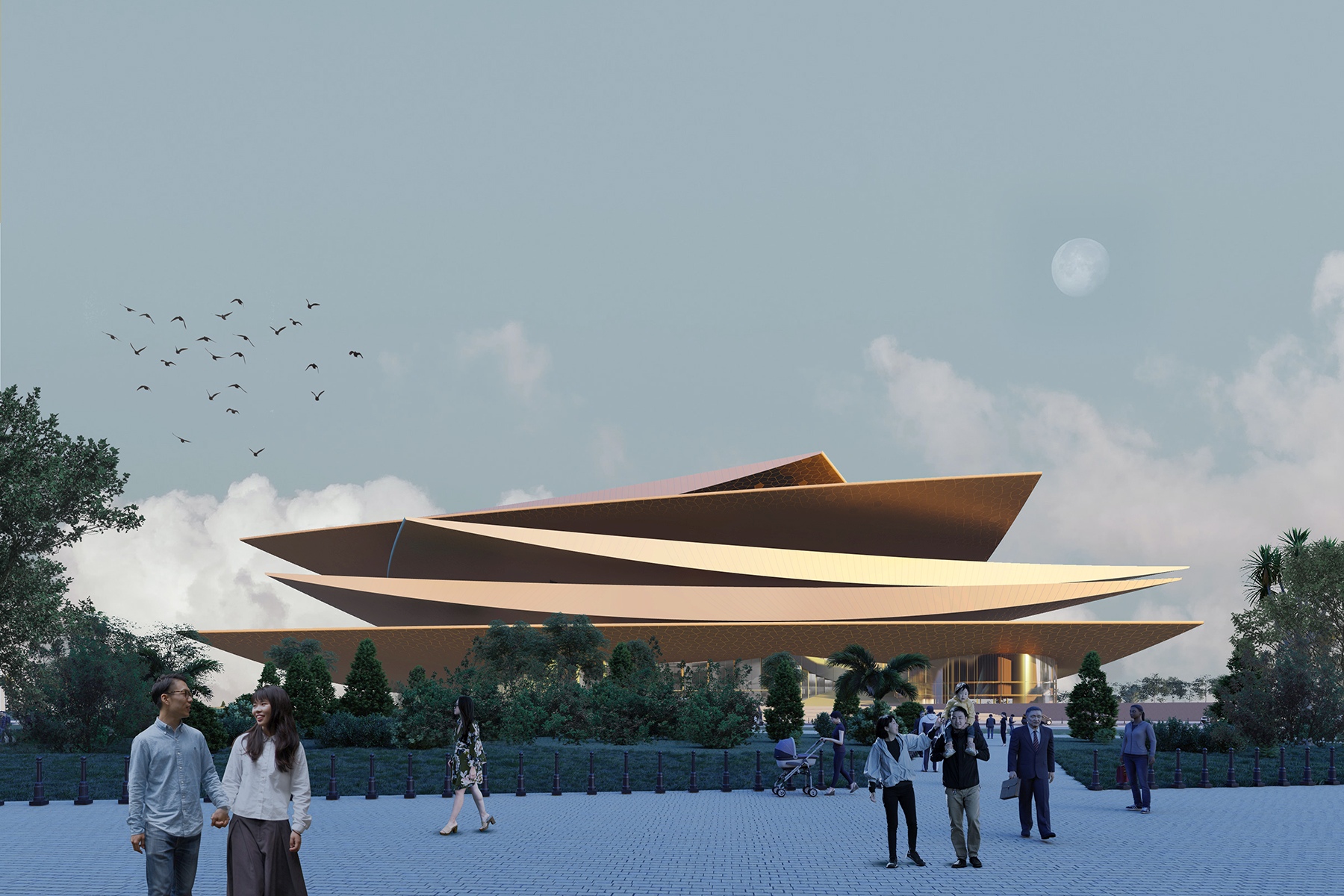 Városépítészeti koncepciónk kialakításakor a pályázati kiírás szempontjait maradéktalanul figyelembe vettük. A megadott közlekedési rendszerek és gyalogos útvonalak kialakítását az elvárások szerint alakítottuk ki. Az operaház épülete körbejárható, minden irányból nyitott és publikus. Szoborszerű megjelenése révén a város különböző pontjairól nézve más-más megjelenést mutat, ugyanakkor bármely irányból tekintünk az épületre, a látvány minden esetben azonos értékű és magas színvonalú. Az operaház körüli parkot olyan jellegzetes formavilággal alakítjuk ki, amely reflektál és egyben ráerősít az épület megjelenésére. Az utak és zöldfelületek kialakítása a tervezési terület központi eleme felé irányítja a park használóit. A szomszédos területekhez való kapcsolódást teljeskörűen biztosítjuk. A koncepció minden egyes részletében akadálymentes használatot tesz lehetővé. Az operaház teljes mértékben körüljárható, ezért az épület körül nagy, egybefüggő burkolt teret alakítunk ki, mely városi fórumként funkcionál. A fogadó tér reprezentatív kialakítású, mely kültéri rendezvényeknek is területet biztosít. Az operaházat a Wanghai út felől impozáns lépcsősoron közelítjük meg. Míg az operaház közelében a reprezentatív funkciók dominálnak, addig a tervezési terület peremein a szabadidős funkciók (játszóterek, fitnesz park, pihenőzónák) válnak jellemzővé. Az operaház és a tengerpart között zöldfelületekkel tagolt lépcsősorok és rámpák készülnek, melyeken ülő- és árnyékoló rendszerek biztosítják a kényelmes használatot. A parti sétány járószintjén helyenként sugárirányú kilátóteraszok nyúlnak a vízfelszín fölé, ezzel is erősítve a tenger és az épület kapcsolatát. A sétányokat fasorok árnyékolják, melyek kellemes, árnyas tereket hoznak létre. A nyílt gyepfelületeket szabálytalanul elrendezett facsoportok, ligetes területek tagolják. A meglévő faállományt megtartjuk, a part menti sétány eredeti funkciója megmarad.