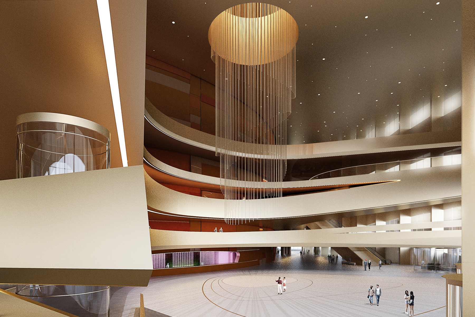Az auditórium az opera, kínai opera, balett és modern táncszínház műfaján túl különlegesen nagyméretű színpadi előadások befogadására is alkalmas. Az operaterem 2300 zsöllyeszékkel rendelkezik, formáját és méretét elsősorban a teremakusztikai szempontok, az oldalirányú rálátás biztosítása, valamint a közösségi és vizuális élmény szempontjainak érvényre juttatása határozta meg. Egyedi erkélyrendszert terveztünk, mely biztosítja a pályázati kiírásban előírt 33 méteres maximális nézői távolságot a színpad homlokától. A modern termektől elvárható módon az utózengési idő változtatható.