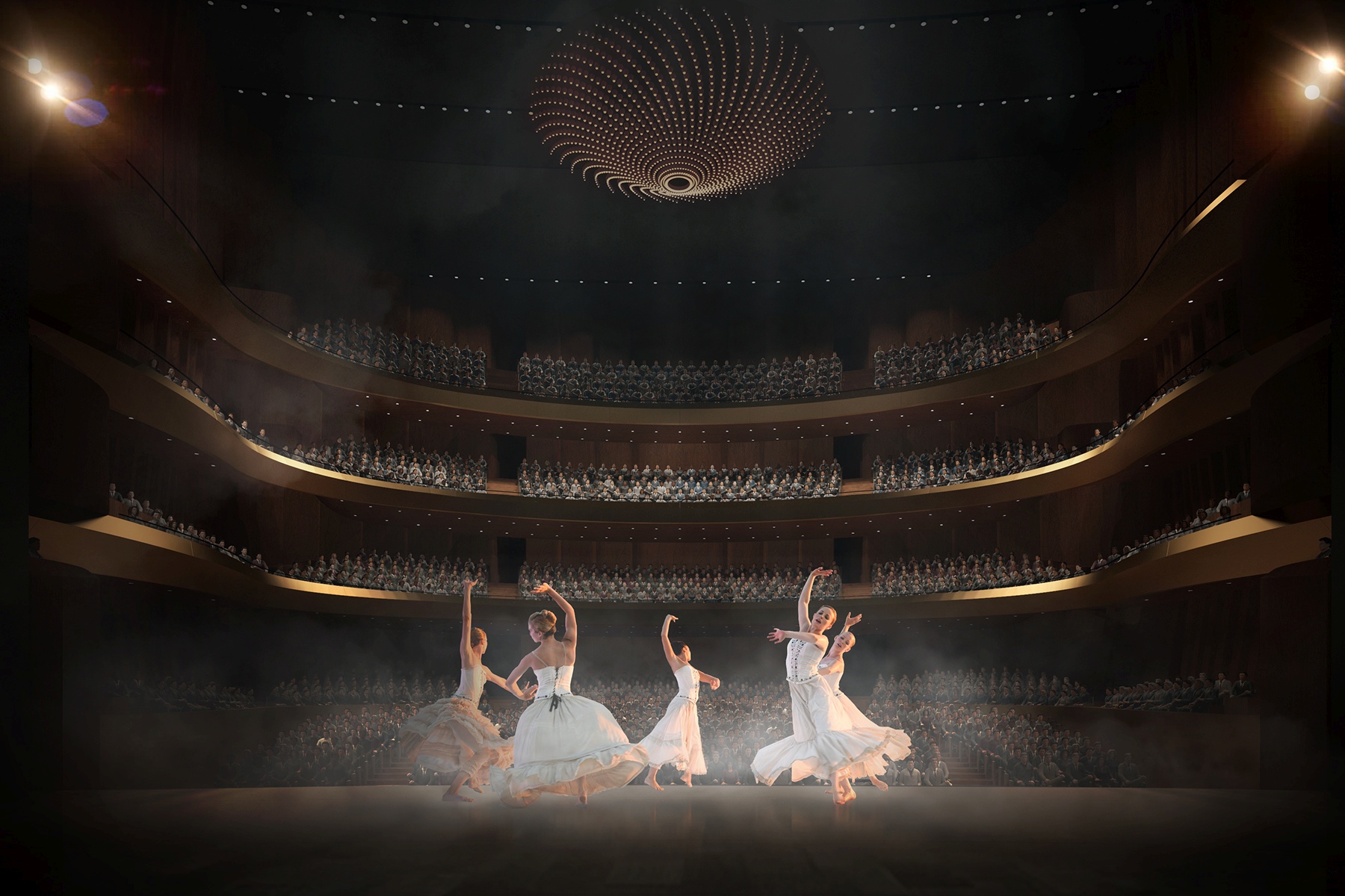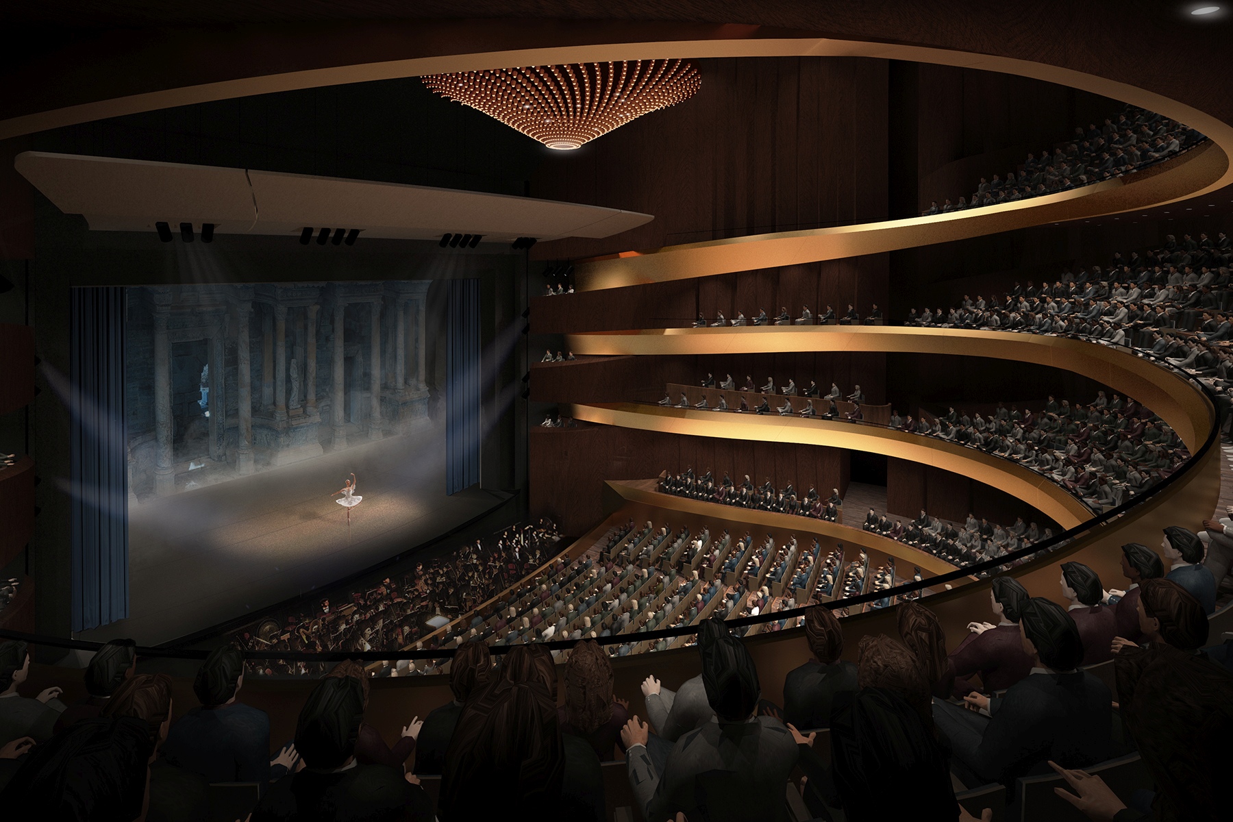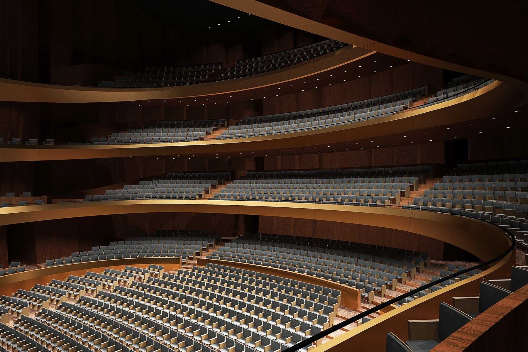 A tervezett teremforma a tradicionális patkóformát követi, mely az elmúlt négy évszázadban töretlen fejlődésével bizonyította a proszcénium formátumának időtállóságát. A koncepció alapja a néző és az előadó közötti közvetlen kapcsolat kialakulása, mely páratlan közösségi élménnyel társul, akusztikáját tekintve pedig az intimitás és a kiváló hangtisztaság letéteményese. A modern termekben ugyanakkor megjelenik a gazdag, telített hangzás (reverberation fullness) igénye is, melynek létrejötte főként a felső technikai terek optimális kialakításával biztosítható és egyúttal manipulálható. Számos kortárs operaházban komoly nehézséget jelent a fenti szempontok érvényre juttatása, az erkélyek hátsó soraiban jellemzően igen száraz hangzás alakul ki. Koncepciónkban a hangzás egyenletességéhez kívántunk hozzájárulni, ezért a karzatokat hídszerűen alakítottuk ki, elvágva az erkélyeket a terem hátsó falától. Így a terem felső régióiban létrejövő kései visszaverődések a karzatok mögötti térben „megtalálják” a hátsó sorokban ülő hallgatókat is, míg az elsődleges oldalirányú visszaverődéseket a tradicionális szerkesztés biztosítja. A lebegő karzatok egyúttal lehetővé teszik, hogy a felsőbb erkélyeket a színpadhoz közelebb alakítsuk ki. Hasonló formai kialakítással néhány koncertteremben már találkozhattunk, azonban a szimfonikus zenét befogadó terekben ezt a megoldást teljesen eltérő teremakusztikai célok, mondhatni kényszerek hatására alkalmazták, ezzel szemben operaházi megvalósítása szerves fejlődést jelenthet: az opera élményének demokratizálódási folyamatában egy újabb lépcsővé válhat.