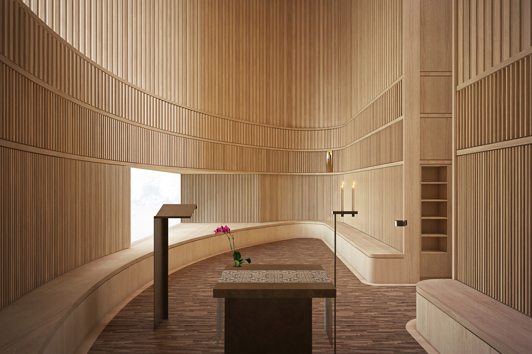A belső tér határolása jellemzően fa burkolatokkal történik. Tölgy padlóburkolat, kőris falburkolat és hófehér gipszkarton mennyezet határozza meg a tér hangulatát, melyben hagyatkozunk a természetes fa illatának atmoszféra-teremtő képességére is. A mobíliák fém anyagúak. A tér hangulatát az irányított és szórt fények játéka határozza meg. A keleti oldalon, a magasabban elhelyezkedő csatlakozó lapostetőn egy néhány négyzetméteres fém tálcát helyezünk el, mely sekély esővíz gyűjtőként működik. A fodrozódó vízfelület a kápolna mennyzetére tükrözi a reggel napfényt, mely így egy önálló hangulati elemmé válik.